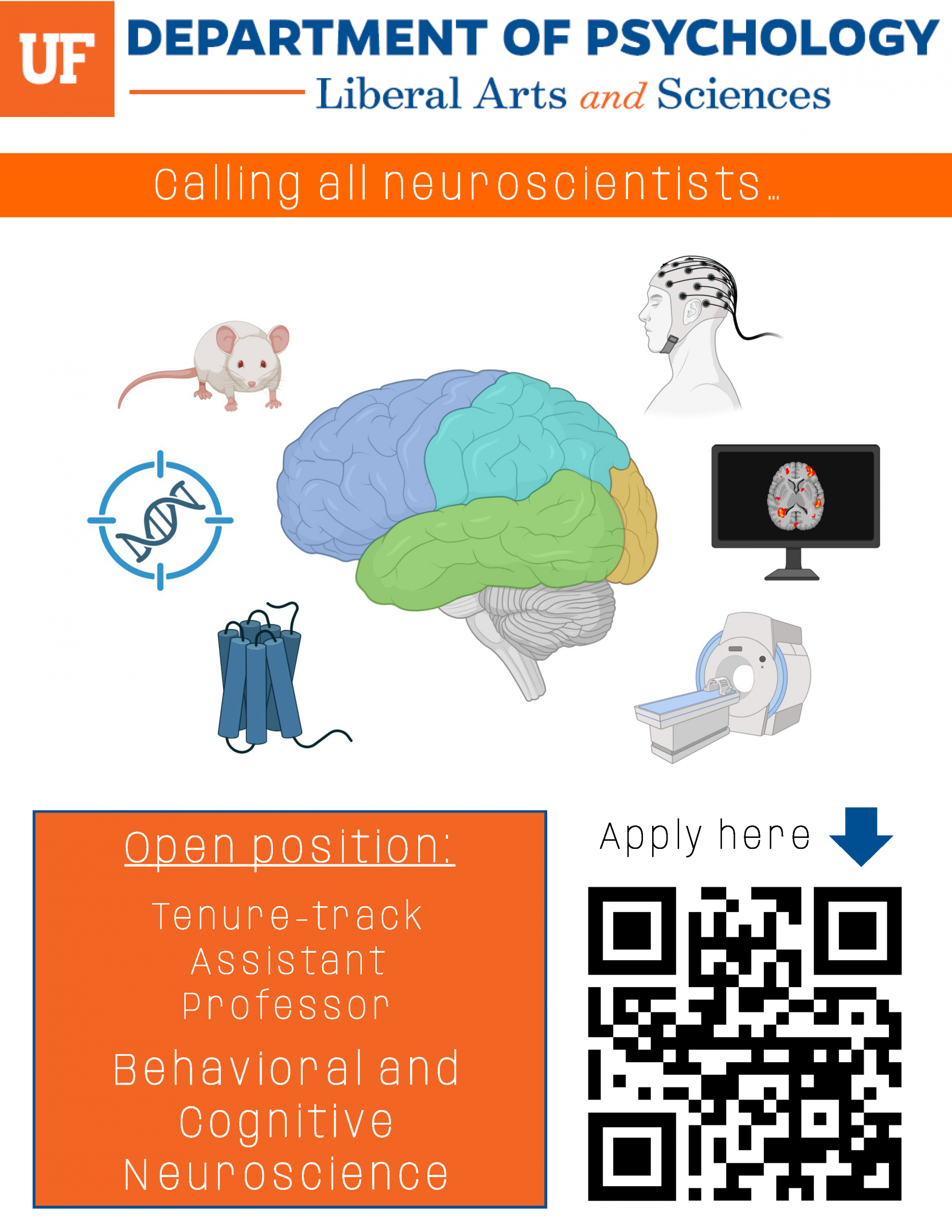 The Department of PSYCHOLOGY at the UNIVERSITY OF FLORIDA, College of Liberal Arts and Sciences, invites applications for a full-time, nine-month, tenure-accruing Assistant Professor in the field of Behavioral and Cognitive Neuroscience. The specific area of research is open but should focus on neuroscience research that complements and expands existing strengths in the department and the university at large, including perception/attention, substance use, decision-making, stress/emotion, and neurodegenerative disorders, in any model system (humans or animals). Applicants should have an outstanding record of research achievement and a commitment to undergraduate and graduate instruction in psychology and neuroscience.